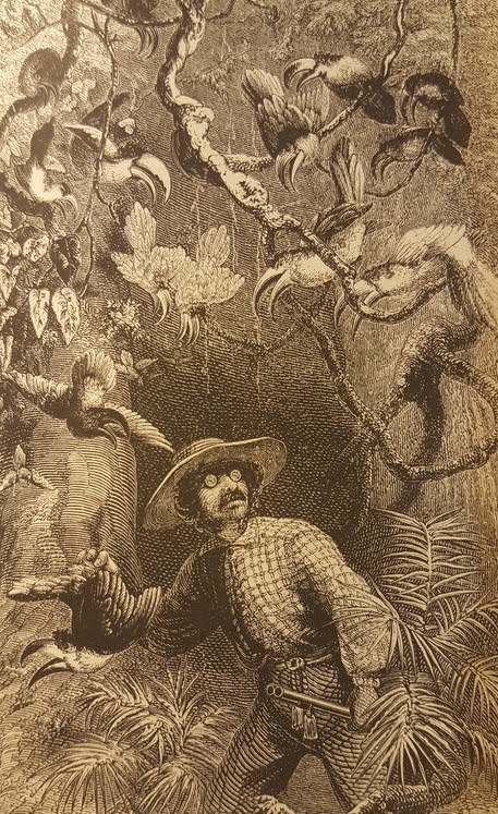 | O Bates κατά τη συνάντησή του με τουκάνους (Λιθογραφία από το βιβλίο του: Ο φυσιοδίφης στον ποταμό Αμαζόνιο) |