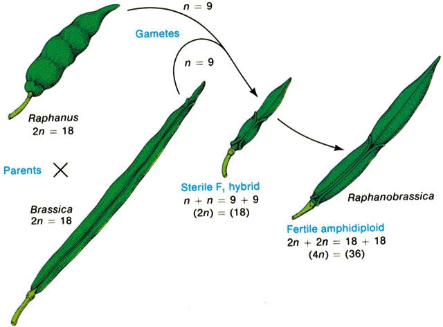 Όλα τα άτομα αυτά ήταν αλλοπολυπλοειδή, δηλαδή άτομα που είχαν λάβει από κάθε προγονικό είδος μια διπλή σειρά χρωμοσωμάτων – όχι δηλαδή 9 αλλά 18 χρωμοσώματα – εξαιτίας ενός αυθόρμητου και τυχαίου διπλασιασμού των χρωμοσωμάτων, ο οποίος δεν επακολουθήθηκε, από διαχωρισμό, σε κάποιον ιστό του υβριδίου που αναπτύχθηκε σε αναπαραγωγικό. Έτσι όταν τα κύτταρα του ιστού αυτού υπέστησαν μείωση, οι γαμέτες που παράχθηκαν είχαν 18 χρωμοσώματα και ήσαν λειτουργικοί, αφού κάθε χρωμόσωμα λαχάνου και κάθε χρωμόσωμα ραπανιού, είχε πλέον τον ομόλογο «συνεταίρο» του, με τον οποίο μπορούσε να συναφθεί!
