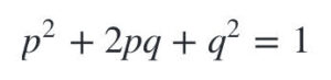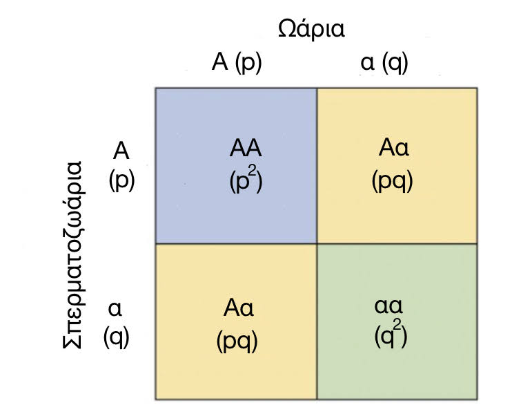 Η συχνότητα των αλληλομόρφων εκφράζεται με δεκαδικούς αριθμούς με βάση το % ποσοστό τους στον πληθυσμό. Αν π.χ. το υπερέχον αλληλόμορφο (Α) υπάρχει στο 35% του πληθυσμού (ο αριθμός είναι εντελώς ενδεικτικός!) τότε η συχνότητά του p (κατά σύμβαση με το γράμμα p ορίζεται η συχνότητα του επικρατούς αλληλομόρφου), είναι 0,35.Συνεπώς, αφού το 100% του πληθυσμού περιλαμβάνει και τα δύο αλληλόμορφα, το υποτελές αλληλόμορφο (α) θα συναντιέται στο 65% του πληθυσμού, συνεπώς θα έχει συχνότητα q (με το q κατά σύμβαση συμβολίζεται η συχνότητα του υποτελούς αλληλομόρφου) 0,65. Ακόμη πιο γρήγορα θα μπορούσαμε να πούμε: p+q=1, συνεπώς το q, θα είναι ίσο με 1-p, ή 0,65.Αυτά, όσον αφορά στη συχνότητα των αλληλομόρφων. Τι γίνεται όμως με τη συχνότητα των γενοτύπων (και εξ αυτής, των φαινοτύπων); Ρίξτε μια ματιά στον ακόλουθο πίνακα που δείχνει πώς υπολογίζεται η πιθανότητα να είναι κανείς ομόζυγος για το υπερέχον αλληλόμορφο (ΑΑ), ετερόζυγος (Αα) ή ομόζυγος για το υποτελές (αα).Όπως φαίνεται, από τον πίνακα στον οποίο παρουσιάζονται οι συχνότητες των αλληλομόρφων Α, α στα ωάρια και στα σπερματοζωάρια (είναι οι ίδιες που ισχύουν σε όλον τον πληθυσμό), οι συχνότητες των γενοτύπων ΑΑ, αα και Αα είναι αντίστοιχα: pxp (δηλαδή p^2), qxq (δηλαδή q^2), και 2pq. Και προφανώς, στο σύνολο του πληθυσμού (100%) το άθροισμά τους: δηλαδή το:θα είναι ίσο με 1.Αν λοιπόν δοκιμάσετε να βρείτε ποια θα είναι η συχνότητα των αλληλομόρφων που θα προκύψει στην επόμενη γενιά, από τα άτομα αυτά, θα διαπιστώσετε ότι θα αναπαραχθεί η συχνότητα των αλληλομόρφων του αρχικού πληθυσμού.Για να ισχύει όμως το ισοζύγιο αυτό υπάρχουν οι εξής προϋποθέσεις:- O πληθυσμός να έχει μεγάλο μέγεθος